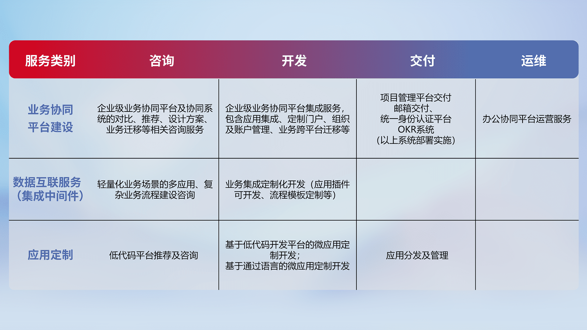 针对钉钉、、、企微、、、IDaas等平台级产品提供产品的规划、、、方案、、交付、、定制化开发等服务,,,,实现如统一协同办公、、、智能客户服务、、、混合会议管理、、智能数据查询、、、等业务场景,,,,实现数字化转型。。